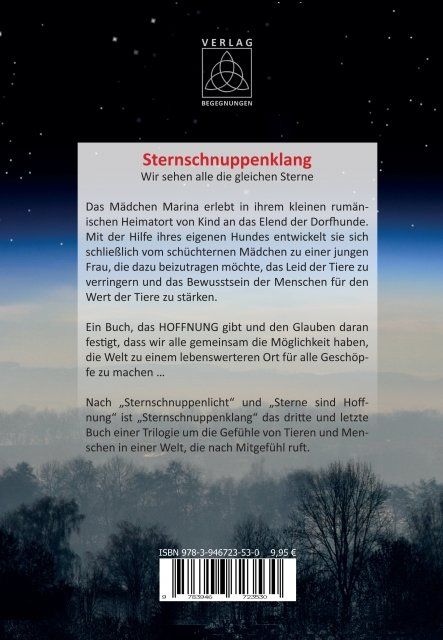 Nach "Sternschnuppenlicht" und "Sterne sind Hoffnung" ist "Sternschnuppenklang" das dritte und letzte Buch einer Trilogie um die Gefühle von Tieren und Menschen in einer Welt, die nach Mitgefühl ruft.