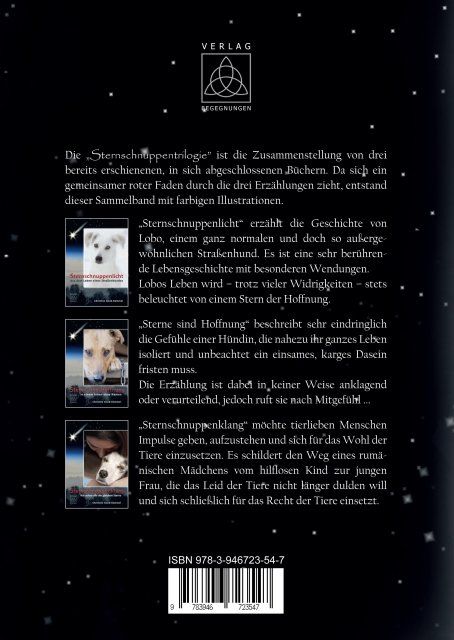 der entstandenen Bücher - "Sternschnuppenlicht", "Sterne sind Hoffnung" und "Sternschnuppenklang" - stehen in einem inneren Zusammenhang. Ein gemeinsamer roter Faden zieht sich durch die Leben der tierischen und menschlichen Protagonisten, die Sie als LeserInnen an ihren Gefühlen und Empfindungen teilhaben lassen.
